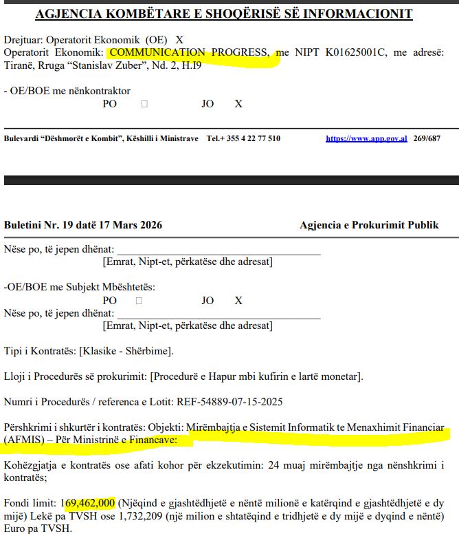 Në të njëjtën ditë, më 17 mars 2026, drejtori Tafa i AKSHI-t ka njoftuar Operatorin Ekonomik: COMMUNICATION PROGRESS se është fitues i tenderit për mirëmbjajtjen e rrjetit të Thesaritt të Shtetit. Edhe ky është tender që ka nisur qysh para një vit dhe ishte pjesë e synimit të “organizatës kriminale”