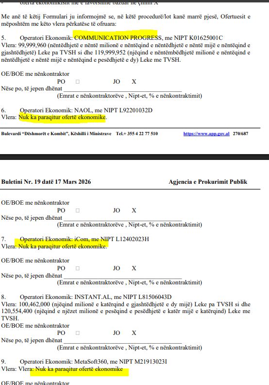Procedura është mbajtur fiktivisht. Sic shihet në dokument, tre operatorë kanë bërë ofertë me vlerë zero lekë.