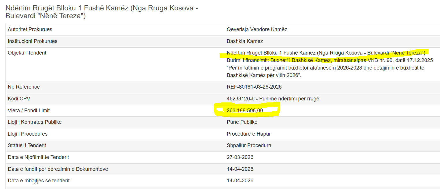 Bëhet fjalë për tenderin me objekt  “Ndërtim Rrugët Blloku 1 Fushë Kamëz (Nga Rruga Kosova – Bulevardi “Nënë Tereza”)”.