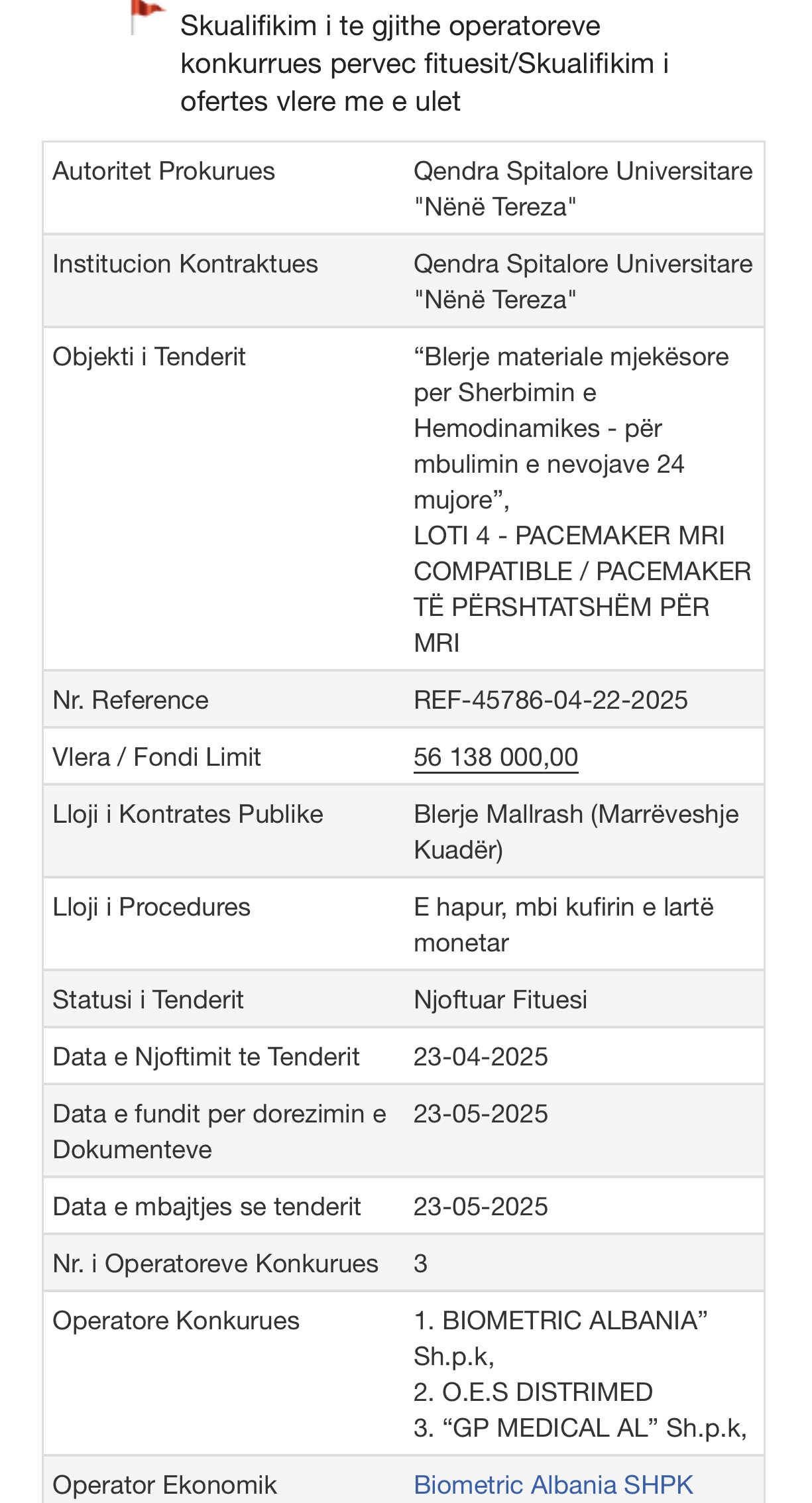 Tenderi është shënuar me Flamur të Kuq pasi nga gara janë skualifikuar të gjithë konkurrentët e tjerë, përfshirë atë që ka dhënë ofertën më të ulët.