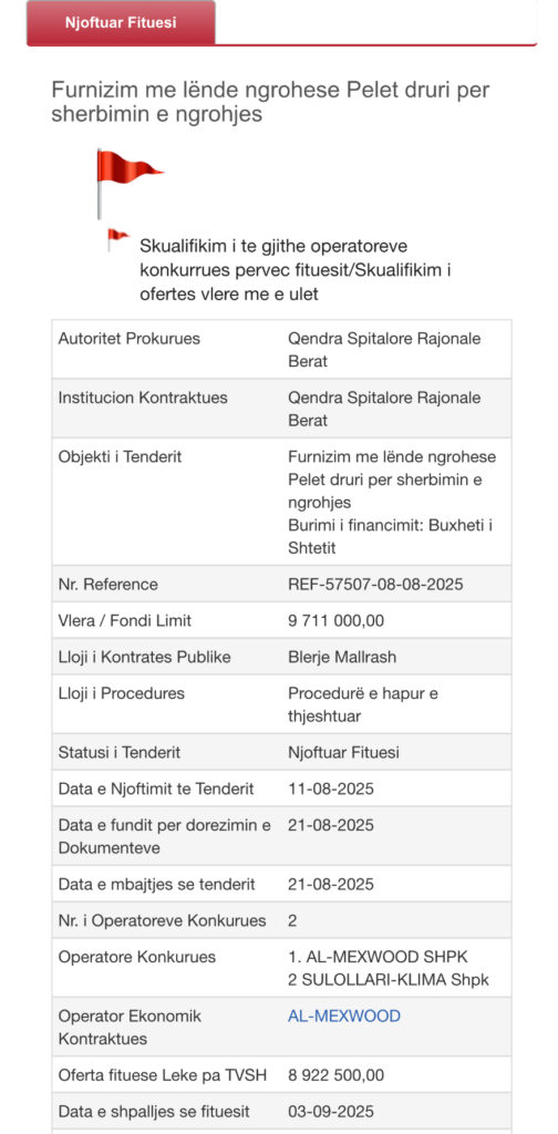 Tenderi, me vlerë mbi 90 milionë lekë (pa TVSH) për “Furnizim me pelet druri”, është fituar nga kompania “AL-MEXWOOD” e zotuar nga Eral Myftaraj, i cili cilësohet nga media si mik i ngushtë i ish-ministrit Bledi Çuçi.