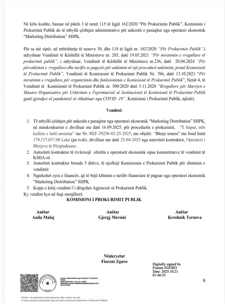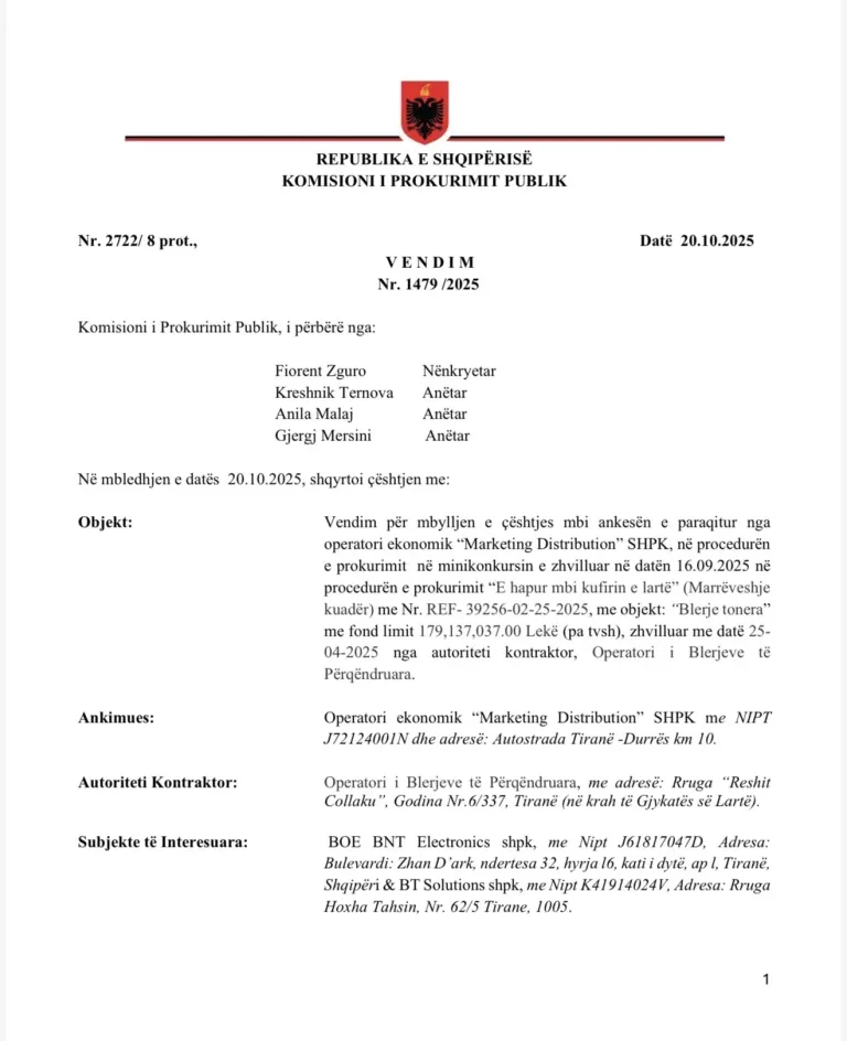 Vendimi nr. 1479/2025, datë 20.10.2025, i Komisionit të Prokurimit Publik (KPP), konfirmon se OBP pranoi ankesën e “Marketing Distribution” dhe mbylli çështjen administrative, duke legjitimuar kualifikimin e kompanisë me ofertën më të shtrenjtë.
