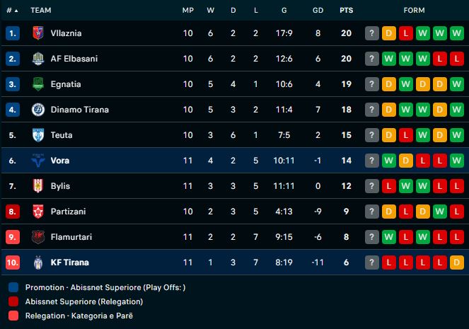 Pas javës së 11-të, Vora me 14 pikë për momentin ndodhet në pozitën e gjashtë, duke lënë Tiranën me vetëm gjashtë pikë në vendin e fundit (10). Raundin që vjen Vora pret Teutën, ndërsa Tirana luan në Vlorë kundër Flamurtarit.