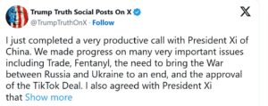 Bëmë përparim në shumë çështje shumë të rëndësishme, duke përfshirë tregtinë, fentanilin, nevojën për t’i dhënë fund luftës midis Rusisë dhe Ukrainës dhe miratimin e marrëveshjes së TikTok”, shkroi Trump në një postim në Truth Social.