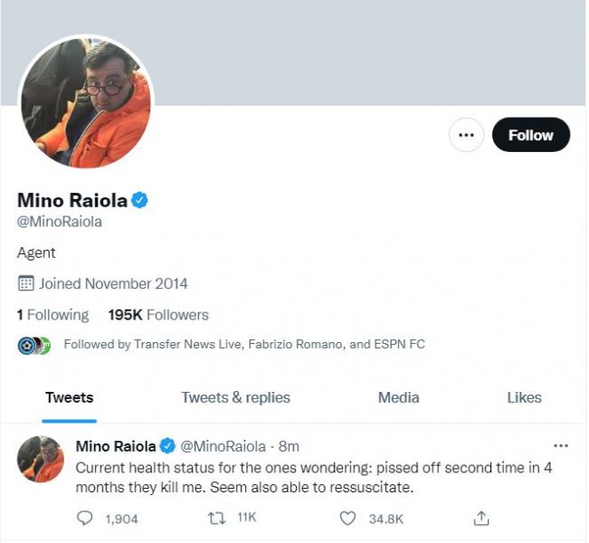 Mino Raiola ka reaguar në Twitter, pak minuta pasi lajmet për vdekjen e tij kishin bërë xhiron e rrjeteve sociale.