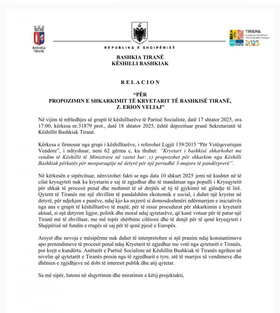 RELACION PËR PROPOZIMIN E SHKARKIMIT TË KRYETARIT TË BASHKISË TIRANË, Z. ERION VELIAJ’