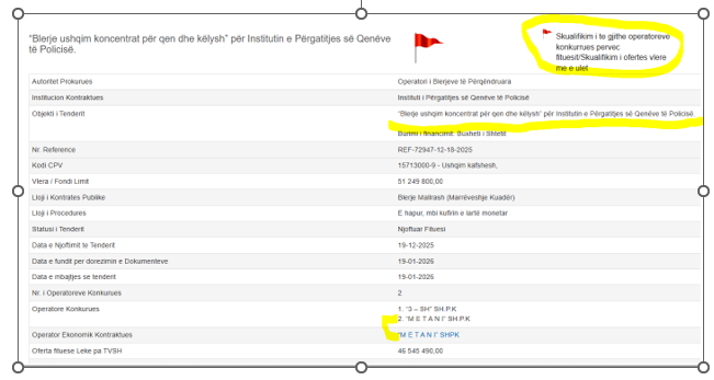 Për bizensmenin e kësaj fushe Albert Metanin ka qenë gjithnjë e lehtë për të përfituar tenderat. Por tashmë fondet janë fryrë dhe fitimi është më i madh. Arlinda Pogaj, vartësja veterane e Gonxhes, drejton Operatorin e Blerjeve të Përqendruara, që ka organizuar tenderin. Për Albert Metanin është eliminuar menjëherë konkurrrenti. “Skualifikim i të gjithë operatorëve konkurrues përvec fituesit/ Skualifikim i ofertës me vlerë më të ulët”. Ky është klasifkimi i bërë nga Open Data Albania, që e shënon me “Flamur të Kuq”. Kujtojmë se ky është sinjal për riskun e korrupsionit.