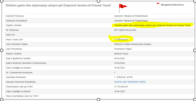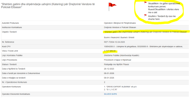 Ndersa ky është tenderi me dy flamuj të kuq korrupsioni i mbajtur më 26 janar 2025. “Shërbim gatimi dhe shpërndarje ushqimi (Katering) për Drejtorinë Vendore të Policisë Elbasan” e ka fondin limit afro 37 milionë lekë.