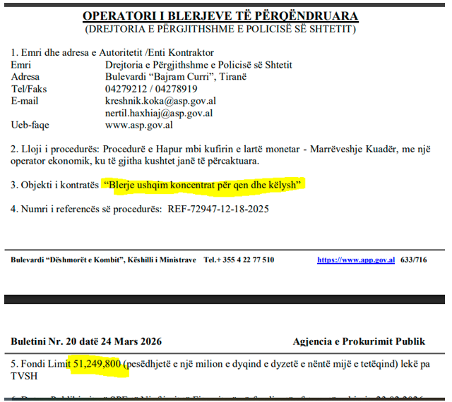 Sipas njoftimit të bërë nga Policia e Shtetit në Agjencinë e Prokurimit Publik, më 24 mars 2026, Fondi i prokuruar me objekt “Blerje ushqim koncentrat për qen dhe këlysh” për Institutin e Përgatitjes së Qenëve të Policisë është mbi 512 milionë lekë.