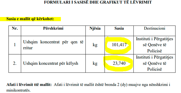 Në këtë tabelë shihet se Instituti do të marrë në dorëzim brenda dy muajve 101 417 kg ushqim koncentrat për qen të rritur dhe 23 740 kg ushqim koncentrat për këlysh.