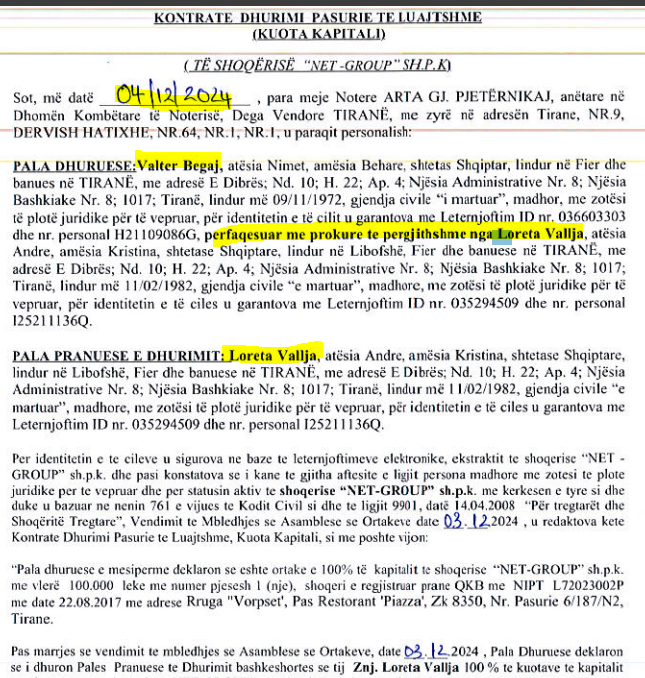 Dhurimi është bërë më 4 dhjetor 2025, ku para noteres ka qenë vetëm bashkëshortja e Valterit. Ajo ka paraqitur një prokurë dhe e ka marrë kompaninë në pronësinë e saj 100%.