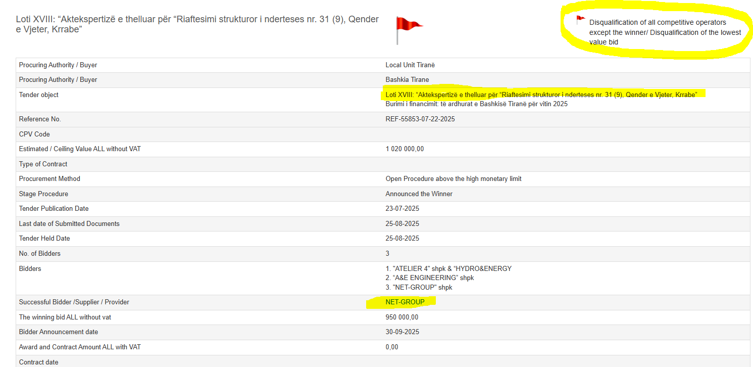 Tenderi është shënuar nga Open Data Albania” me “Flamur të kuq” që është shenja e riskut të korrupsionit.
