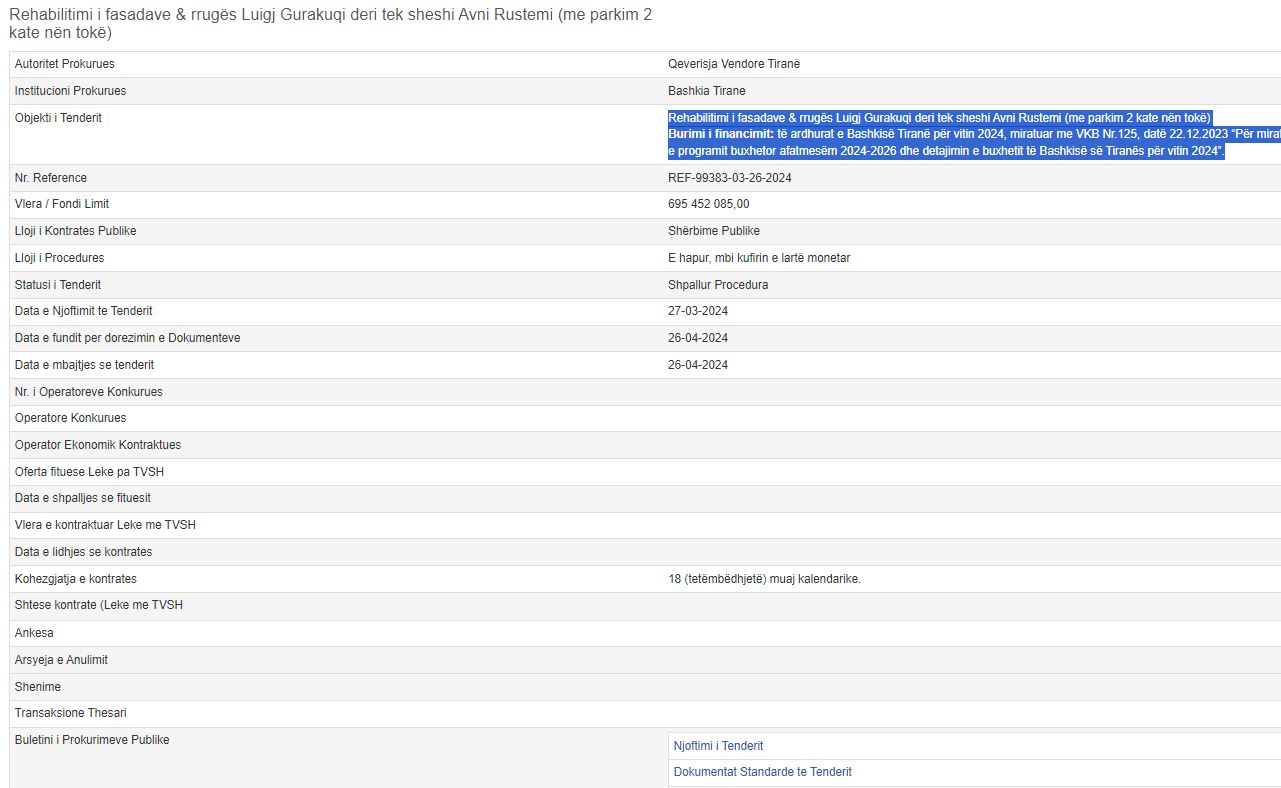 Epo Veliaj nuk do t’ia dijë për këto, përqendrimi i tij është tek interesat e oligarkëve. Më datë 27 mars Bashkia Tiranë ka hapur thirrjen për tenderin me objekt Rehabilitimi i fasadave & rrugës Luigj Gurakuqi deri tek sheshi Avni Rustemi (me parkim 2 kate nën tokë). Futja e fasadave në të njëjtin tender me parkingun bëhet thjesht për të fryrë fondin limit, pasi aty të gjitha godinat janë rregullta dhe të kuruara nga jashtë.