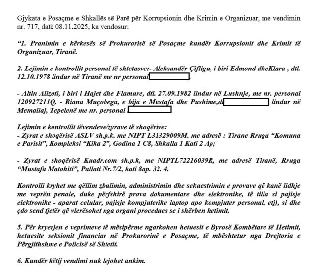 Mbi bazën e këtyre të dhënave, Prokuroria e Posaçme mori autorizimin e gjykatës për lejimin e kontrollit personal të administratorit të “ASLV”, Altin Alizoti dhe drejtuesit të “Kuadr.com”, Aleksandër Çifligu.