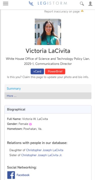 Drejtore e Komunikimit në Zyrën e Shkencës dhe Teknologjisë të Shtëpisë së Bardhë: Në janar 2025, Victoria LaCivita u emërua Drejtoreshë e Komunikimit në këtë zyrë, një pozicion kyç për koordinimin e komunikimit në fushat e shkencës dhe teknologjisë në administratën amerikane.