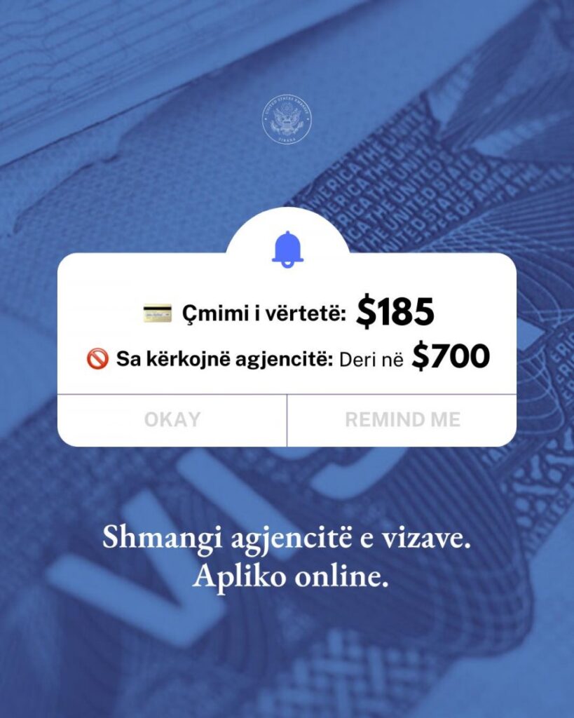 “Mos u mbështetni te një agjenci për të plotësuar saktë aplikimin tuaj. Gabimet mund të çojnë në refuzim të aplikimit tuaj dhe dhënia e informacionit të rremë mund të parandalojë udhëtimin tuaj në të ardhmen. Mbroni veten dhe të dhënat tuaja ndërsa kurseni para – shmangni agjentin e vizave dhe aplikoni vetë online për një vizë amerikane. Mos harroni, Ambasada e ShBA në Tiranë është i vetmi burim zyrtar i informacionit për vizat e ShBA në Shqipëri dhe ne e ofrojmë këtë falas”, shkruan ambasada.