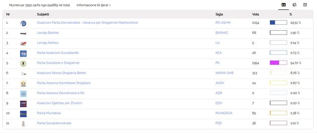 Sipas projeksioneve të deritanishme, Partia Socialiste ka siguruar 83 mandate, Partia Demokratike 5o mandate, PSD 3 mandate, Mundësia 2 mandate, Nisma Shqipëria Bëhet 1 mandat.
