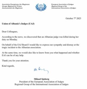 Në një mesazh zyrtar drejtuar Shoqatës Shqiptare të Gjyqtarëve, bordi i EAJ shpreh ngushëllimet më të sinqerta dhe indinjatën e thellë për këtë akt të paprecedentë, duke garantuar mbështetje të plotë dhe solidaritet me kolegët shqiptarë në këtë moment të vështirë për drejtësinë.