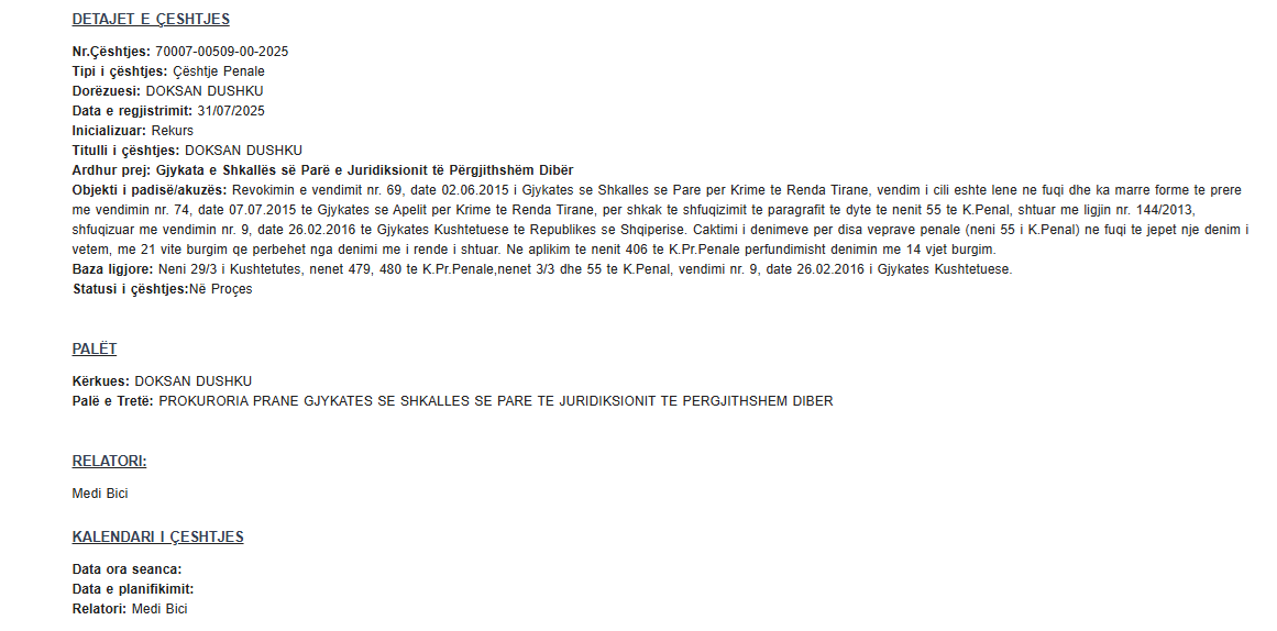 Në rekursin që mban datën 31 korrik, Doksan Dushku kërkon që përfundimisht të dënohet me 14 vite në total, duke përfituar ulje prej 2 vitesh.