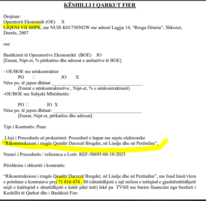 Kështu, me një shkresë të datës 19 janar 2026, pronari Kalia i “LIQENI VII” SHPK, me seli në Shkozet, Durrës, është njoftuar në mënyrë finale nga kryetarja e Këshillit të Qarkut Fier, të paraqitet dhe të firmosë kontratën 710 milionë lekë.