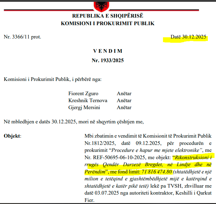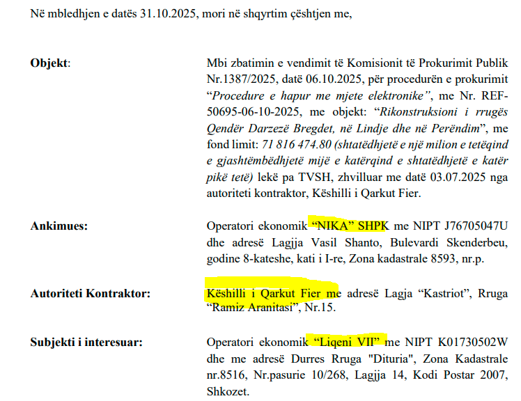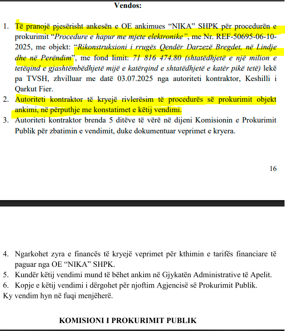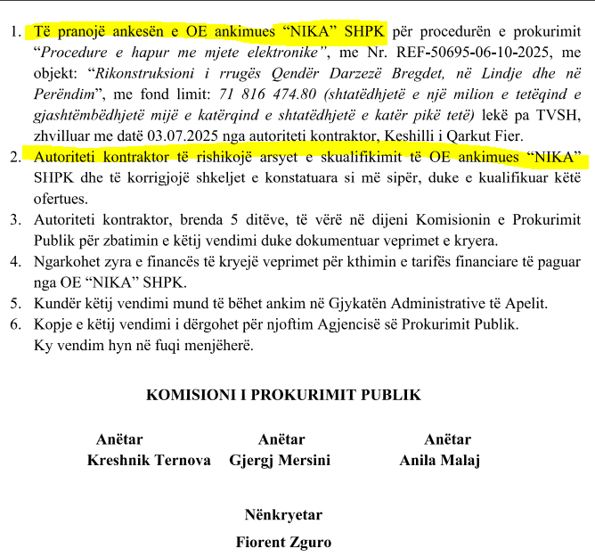 Kështu më 22 tetor 2025, Këshilli i Qarkut u urdhërua nga KPP të ndryshojë statusi i këtij ofertuesi nga “i skualifikuar” në “i kualifikuar”.