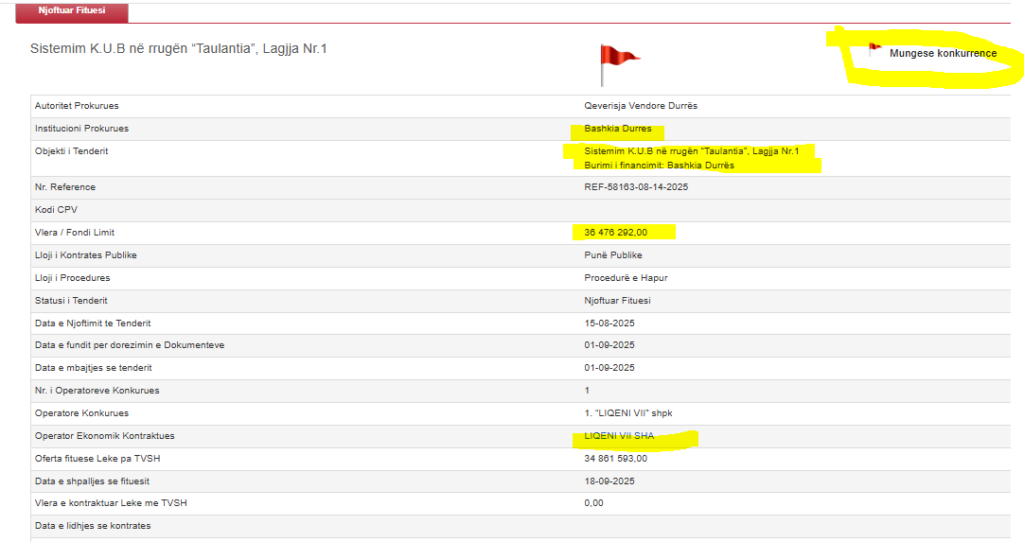 Kjo ndodh rëndom kur fituesi dihet se është i paracaktuar. Open Data Albania e ka shënuar këtë tender me “Flamur të kuq”, për të treguar riskun e korrupsionit.