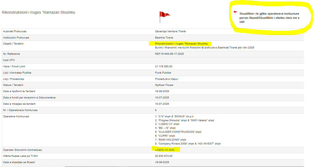 Në tenderin e mbajtur më 10 korrik 2025 merrnin pjesë 8 operatorë ekonomikë dhe bashkime kompanish. Megjithatë pjesëmarrja e tyre është vetëm për statistikë, sepse në tender është favorizuar haptazi firma “LIQENI VII”. Fillimisht janë hequr nga rruga e Ramazanit dy ofertat më të ulëta duke i skualifikuar. Njëra nga kompanitë sipas komisionit të Anuelës, nuk përmbushte kriteret, ndërsa tjetra ishte ofertë “anomalisht e ulët”.