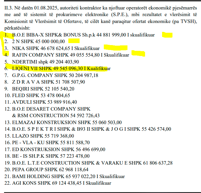 Ndërsa Operatori ekonomik “NIKA” SHPK ka prezantuar ofertën ekonomike: 46 678 624,65 lekë pa TVSH. Edhe firma “RAFIN COMPANY” SHPK ka ofertë më të ulët, 49 055 554,80 lekë pa TVSH.