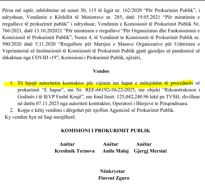 Në mënyrë formale, më 24 dhjetor 2025 Komisioni i Prokurimit Publik ka marrë vendimin tjetër: Të lejojë autoritetin kontraktpr të vijojë me hapat e mëtejshem të procedurës së prokurimit.