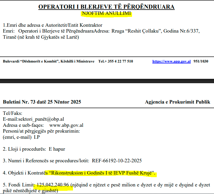 Ky tender është anuluar një herë dhe më pas është mbajtur me shpejtësi rrufe. Konkretisht prokurimi u njoftua për herë të parë më 13 gusht 2025 dhe duhej të mbahej më 29 gusht. Pas anulimit është mbajtur më 3 shtator 2025. Ndërsa më 25 shtator 2025 është shpallur fituesi.