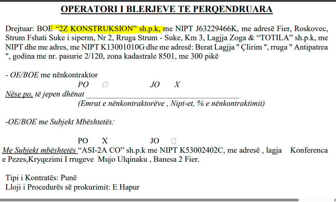 Kontrata është fituar nga operatori ‘2Z KONSTRUKSION SHPK’ me administrator shtetasin Zani Zoga.