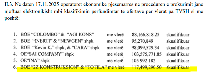 Oferta fituese e kompanisë ”2Z KONSTRUKSION” me pronarin Zani Zoga në bashkëpunim me ”TOTILA” sh.p.k është më e lartë se të gjitha: 117,499,290.50 lekë pa tvsh. Kjo kompani, që dyshohet se është e paracaktuar si fituese, ka bërë ankesë edhe në komisionin e tenderit edhe në KPP.