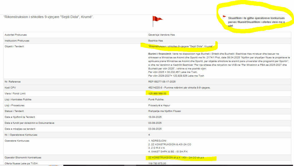 Paralelisht me tenderin për rikonstruksion në burgun e Fushë-Krujës, Zani Zoga ka marrë një kontratë tjetër publike. Bëhet fjalë për tenderi i firmosur nga kryetari i Bashkisë Has, Miftar Dauti, që ka si objekt “Rikonstruksionin e shkollës 9-vjeçare “Sejdi Dida”, Krumë”. Punimet janë përllogaritur të kushtojnë një fond limit prej 125 968 569,00 lekësh pa TVSH.