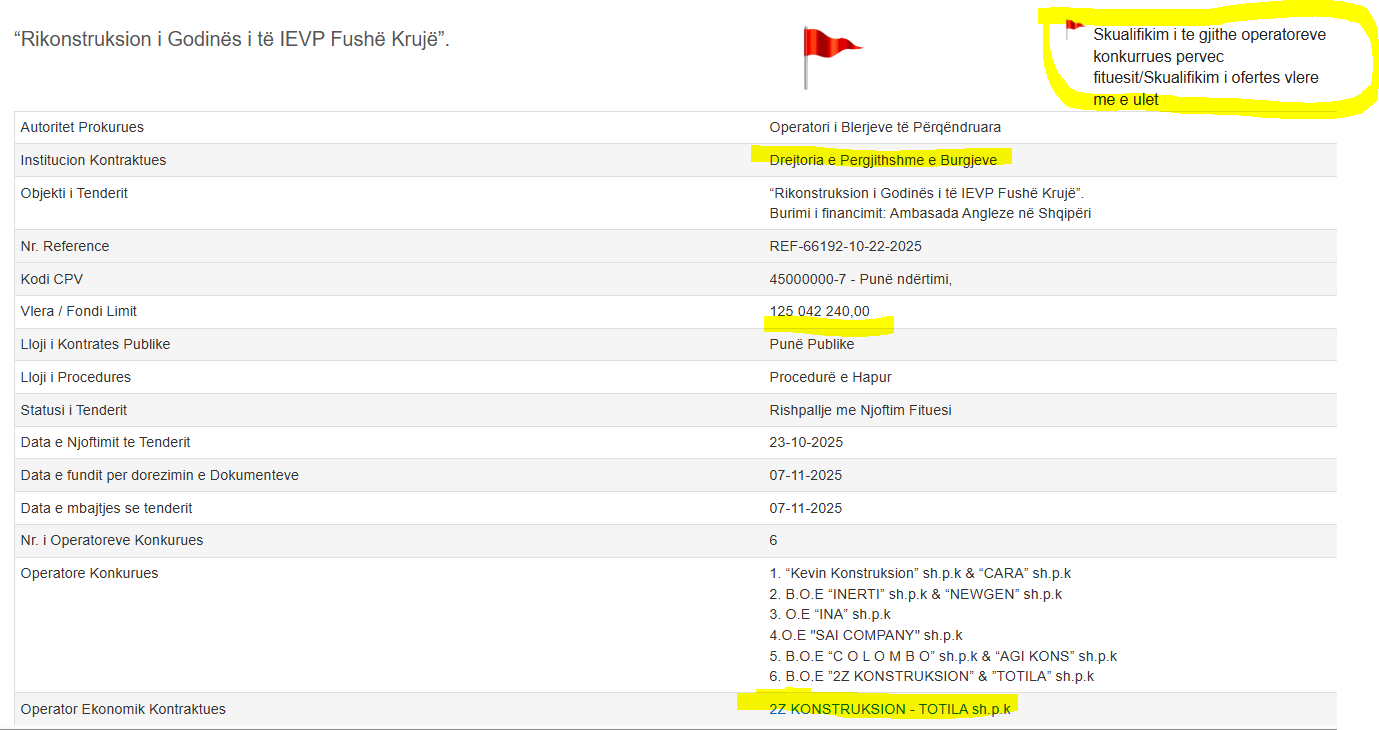 Open Data e Albania e ka shënuar tenderin me “Flamur të kuq” që është sinjalizimi për risk korrupsioni.
