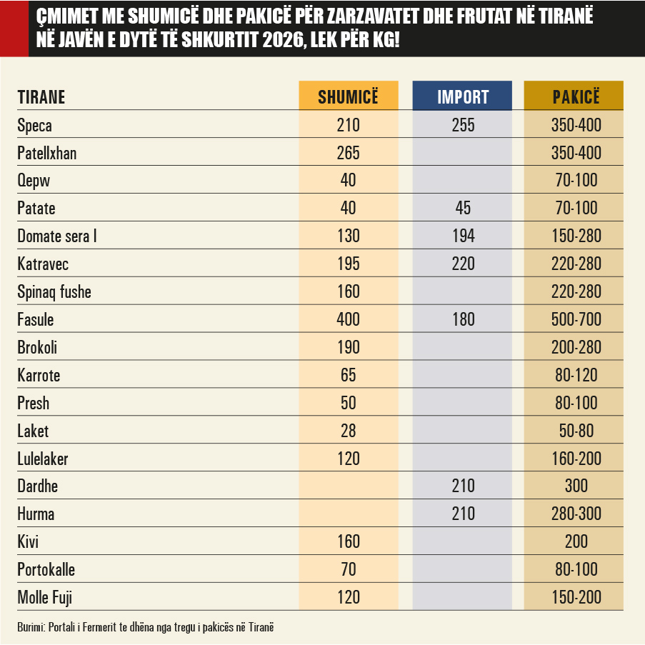 Analiza e tregut të shumicës në Shqipëri për muajin shkurt 2026, mbështetur në databazën e çmimeve të përditësuara në Portalin e Fermerit, tregon vështirësitë që sjell sezoni i dimrit për bujqësinë vendase.