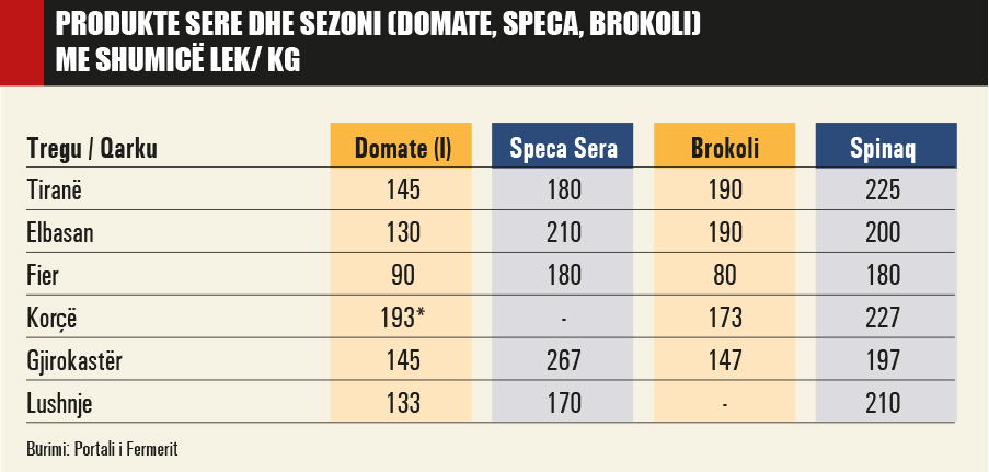 Një kilogram spinaq fushë u shit me shumicë, sipas të dhënave nga Portali i Fermerit, më 6 shkurt me 160 lekë për kilogram, ndërsa me pakicë, çmimi arriti në të njëjtën ditë në kryeqytet në 300 lekë/kg. Brokoli gjithashtu nga 190 lekë me shumicë shitet rreth 250-300 lekë me pakicë në tregjet e Tiranës në të njëjtën ditë.