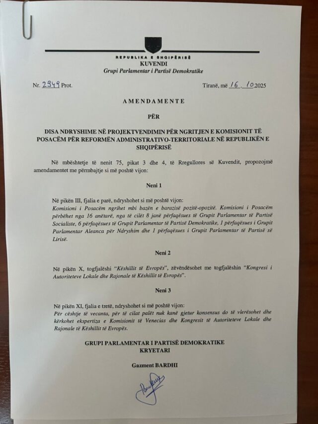 Partia Demokratike ka kërkuar ndryshime në vendimin për ngritjen e Komisionit të Posaçëm për Reformën Zgjedhore dhe Komisionit të Posaçëm për Reformën Territoriale.