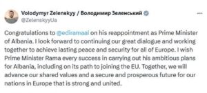 “Urime për @ediramaal për rizgjedhjen si Kryeministër i Shqipërisë. Mezi pres të vazhdojmë dialogun tonë të shkëlqyer dhe të punojmë së bashku për të arritur paqe dhe siguri të qëndrueshme për gjithë Evropën,” shkruan Zelensky.
