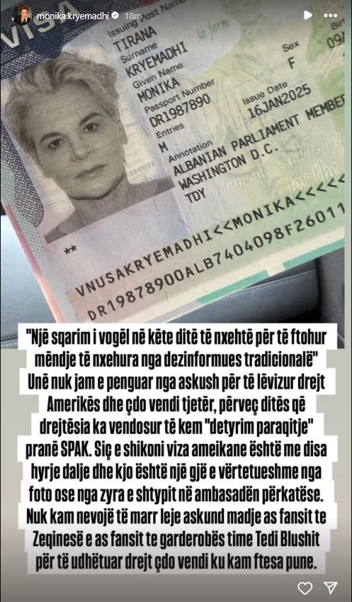 “Një sqarim i vogël në këtë ditë të nxehtë për të ftohur mendje të nxehura nga dezinformues tradicionalë. Unë nuk jam e penguar nga askush për të lëvizur drejt Amerikës dhe çdo vendi tjetër, përveç ditës që drejtësia ka vendosur të jem në “detyrim paraqitje” pranë SPAK.