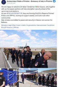 “Jemi të lumtur të mirëpresim 24 karabinierë italianë ???????? në Kosovë, të cilët, së bashku me partnerët evropianë, do të ndihmojnë në forcimin e sigurisë para zgjedhjeve lokale.